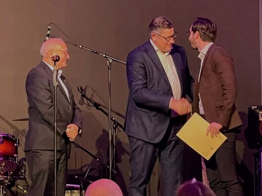 Drei Männer stehen in festlicher Kleidung auf einer Bühne. Sie schauen das Publikum an und der Mann in der Mitte präsentiert eine Auszeichnung und hält in der anderen Hand einen Blumenstrauß.