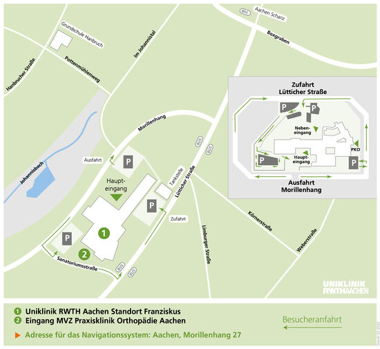 Parkgelegenheiten finden Sie auf unserem Parkplatz P1, rund um das Gebäude, auf der Lütticher Straße oder auf der Sanatoriumstraße. Bitte beachten Sie, dass sich am Morillenhang auch Anliegerparkplätze befinden.