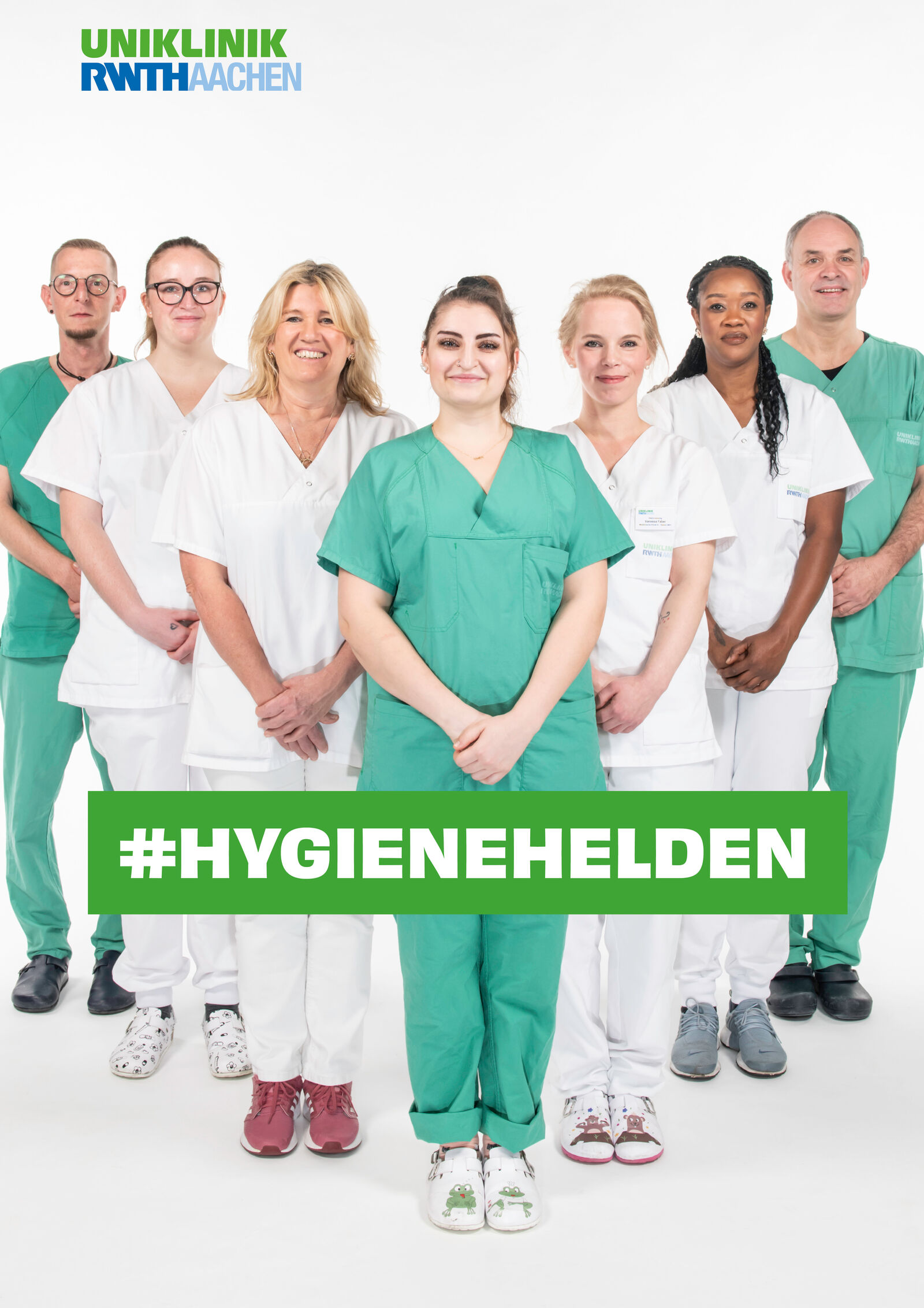 Die neue Kampagne „#Hygienehelden“ rückt die Themen Krankenhaushygiene und Infektiologie in den patientennahen Bereichen in den Fokus und weist auf die Einhaltung dieser Vorschriften hin. Die Fotomodelle der insgesamt elf Plakate stammen alle bewusst aus Pflegeabteilungen oder anderen patientennahen Bereichen der Uniklinik RWTH Aachen, was Raum für Identifikation schafft. „Grundsätzlich sind alle Mitarbeiterinnen und Mitarbeiter selbstverständlich mit den Hygienerichtlinien vertraut und wissen, was sie für eine effektive Händedesinfektion beachten müssen. Aber Routine im Arbeitsalltag kann mit Nachlässigkeit einhergehen. Unsere Kampagne ist gewissermaßen eine Erinnerung – wir möchten ein Zeichen setzen für die Einhaltung der Hygienemaßnahmen. Das gilt nicht nur für die Mitarbeitenden, sondern auch für Patientinnen und Patienten sowie Besucherinnen und Besucher. So können wir Krankenhausinfektionen effektiv vermeiden und gemeinsam Gesundheit schützen“, erklärt Dr. med. Thomas Schwanz, Leiter des Zentralbereichs für Krankenhaushygiene und Infektiologie an der Uniklinik RWTH Aachen.