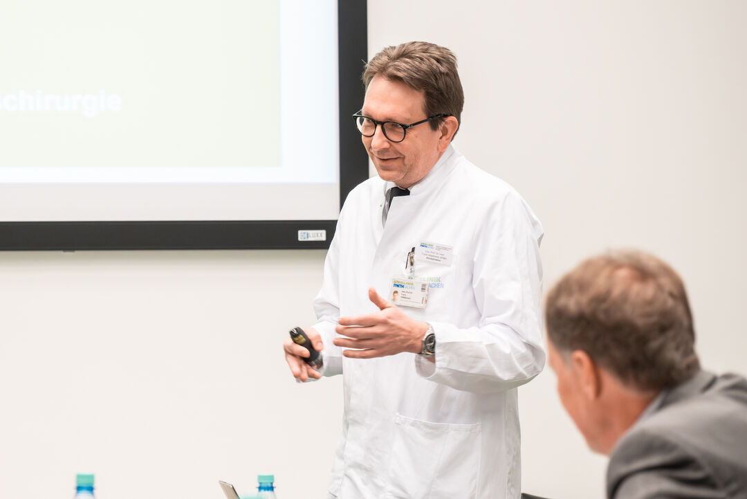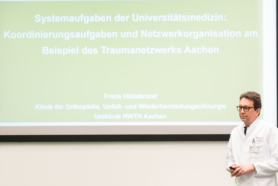 Anlass für den Besuch des Ministers im engeren Sinne war es, einen Überblick über die Systemaufgaben der Universitätsmedizin am Beispiel des TraumaNetzwerk® EURegio Aachen zu erhalten. Die Aachener Klinik für Orthopädie, Unfall- und Wiederherstellungschirurgie unter der Leitung von Univ.-Prof. Dr. med. Frank Hildebrand koordiniert dieses Netzwerk, um eine optimale Versorgung von schweren Verletzungen in der Region sicherzustellen. Mit ähnlicher Zielsetzung ist die Klinik als eine von nur zwei Kliniken in NRW als Traumazentrum nach G-BA-Richtlinien anerkannt. Als eine Voraussetzung für die Anerkennung wird beispielsweise 24/7 ein CT im Operationssaal vorgehalten, um optimale Operationsergebnisse selbst bei schwersten Verletzungen erreichen zu können.