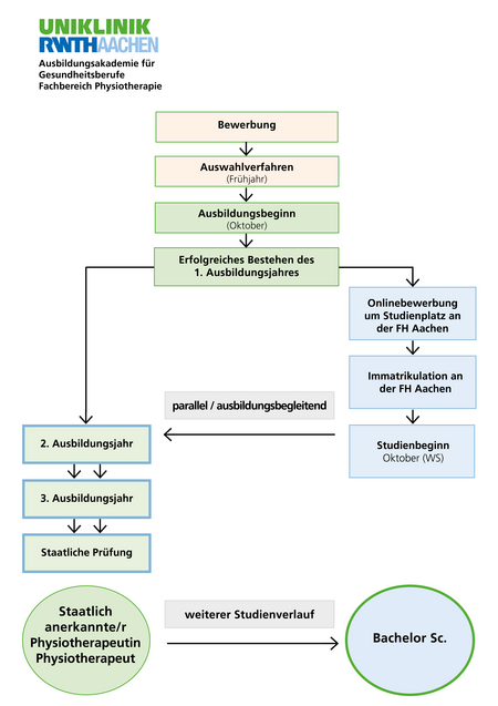Der Fachbereich Physiotherapie der Ausbildungsakademie für Gesundheitsberufe Uniklinik RWTH Aachen bietet die Möglichkeit, ausbildungsbegleitend Physiotherapie zu studieren. Der Bachelorstudiengang Physiotherapie wird von dem Fachbereich Medizintechnik und Technomathematik der Fachhochschule Aachen/Campus Jülich in Kooperation mit der Medizinischen Fakultät der RWTH Aachen angeboten. Die Schwerpunkte des Bachelorstudienganges sind Innovative Technologien in Medizin und Therapie, Biomechanik, Rehabilitationstechnik und Neurorehabilitationstechnik.