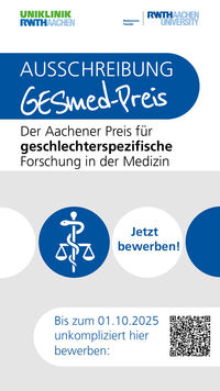 Die Medizinische Fakultät vergibt in diesem Jahr erstmalig den Preis für geschlechterspezifische Medizin (GESmed). Der Preis ist mit 3.000 Euro dotiert. Bewerbungen sind ab sofort möglich, die Bewerbungsfrist endet am 01. Oktober 2025.