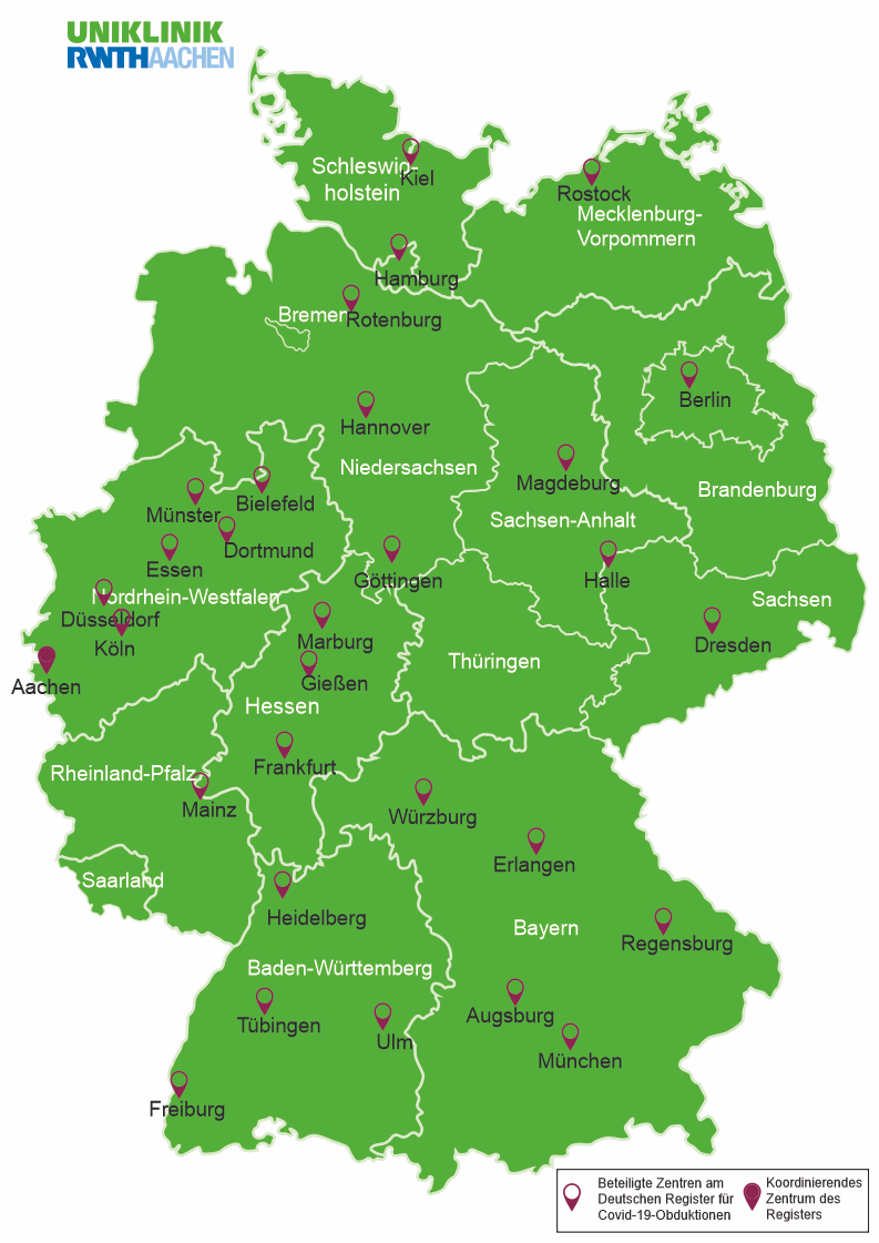 Angesichts der COVID-19-Pandemie haben Forscherinnen und Forscher der Uniklinik RWTH Aachen im Jahr 2020 zusammen mit den nationalen Fachgesellschaften der Pathologie, Neuropathologie und Rechtsmedizin ein zentrales Register für Obduktionen von an COVID-19 verstorbenen Personen aufgebaut. Ziel ist es, gemeinsam ein nationales vollumfassendes Register aufzubauen, in dem die Obduktionsergebnisse möglichst aller an COVID-19 verstorbenen Menschen in Deutschland erfasst werden. Dieses Register ist in seiner Art weltweit das Erste und ein gelungenes Beispiel für die breite Kooperation unterschiedlicher Wissenschaftlerinnen und Wissenschaftler. Durch eine außerordentliche Mitarbeit aller Zentren umfasst das Register mehr als drei Viertel aller nationalen Universitätsinstitute für Pathologie, Neuropathologie und Rechtsmedizin sowie auch mehrere nicht-universitäre Zentren. Bis zum Oktober 2021 wurden bereits über 1.100 Obduktionsfälle in der gemeinsamen Datenbank dokumentiert, was international die aktuell größte multizentrische Studie darstellt.