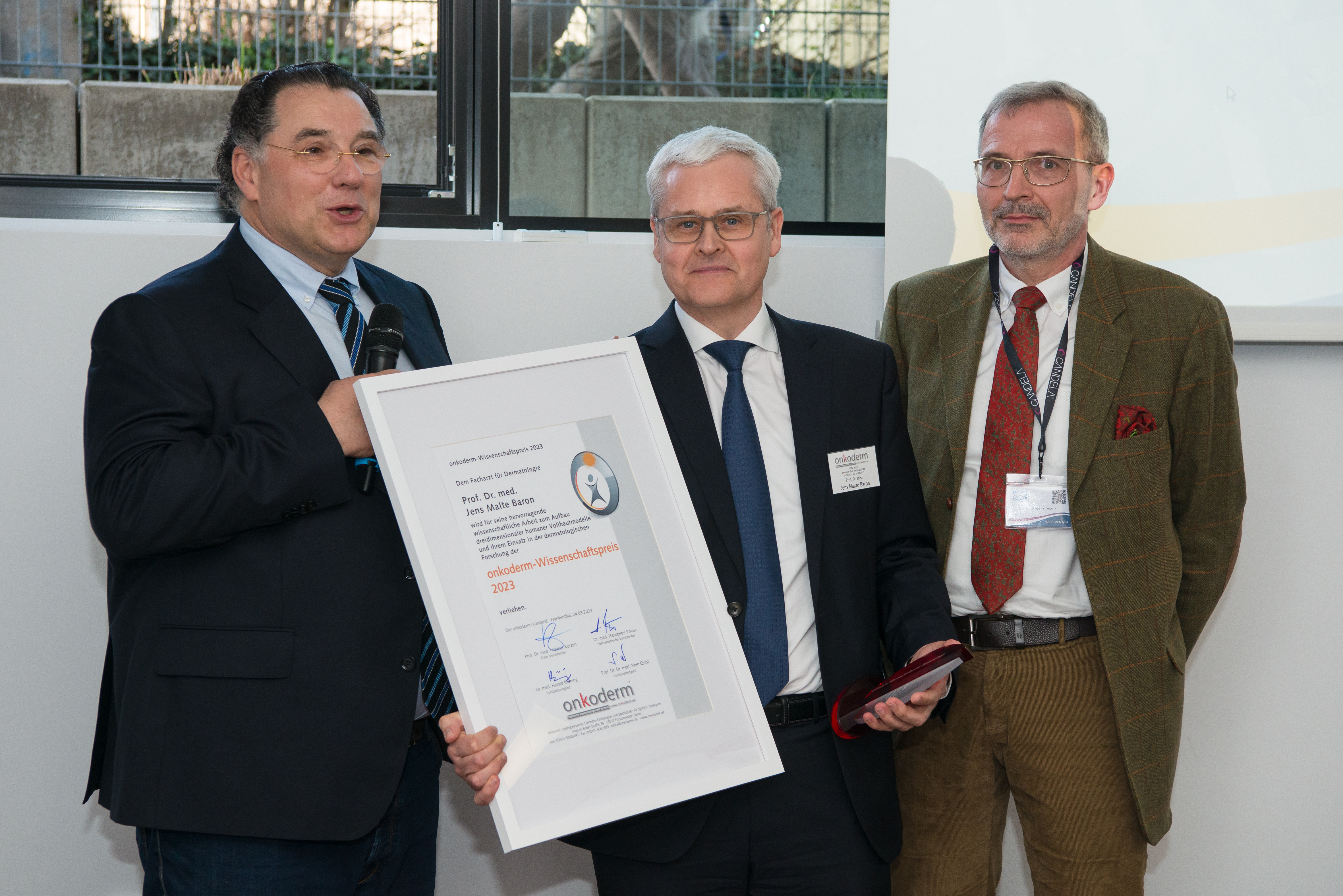 Für seine dermatologische Forschung zu dem Thema „Einsatzmöglichkeiten von 3D-Hautmodellen“ hat Prof. Dr. med. Jens Malte Baron, D.A.L.M., stellvertretender Direktor der Klinik für Dermatologie und Allergologie – Hautklinik und Leiter des interdisziplinären Zentrums für Lasermedizin an der Uniklinik RWTH Aachen, den diesjährigen Wissenschaftspreis des bundesweiten Netzwerks onkoderm e. V erhalten. Der Preis wurde im Rahmen der bundesweit größten Fachtagung für niedergelassene Dermatologinnen und Dermatologen, der DERM-Tagung, vom 24. – 26. März 2023 im CongressForum in Frankenthal verliehen. Mit dem Wissenschaftspreis zeichnet onkoderm e. V. einmal jährlich herausragende Medizinerinnen und Mediziner im Bereich der Dermatologie aus.