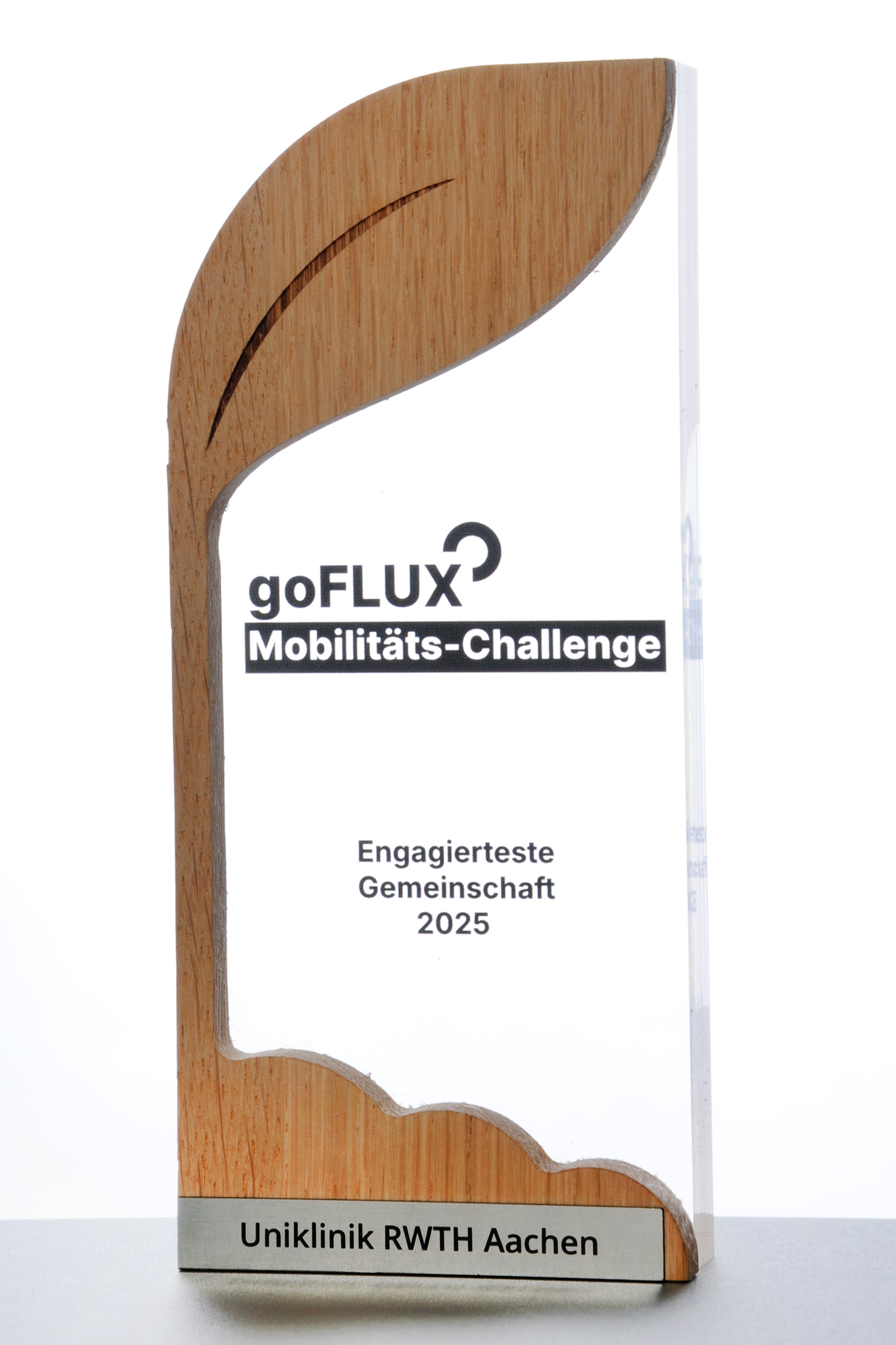 Im Zuge der Preisverleihung rund um die goFLUX Mobilitäts-Challenge während der Europäischen Mobilitätswochen von September bis Oktober 2025 durfte die Uniklinik RWTH Aachen den Preis in der Kategorie „Engagierteste Gemeinschaft“ im Unternehmensvergleich entgegennehmen. Die Stadt Aachen gewann im Städtevergleich in der gleichen Kategorie. Das Aachener Fahrgemeinschaftsnetzwerk ist somit doppelt für seine aktive Community prämiert.