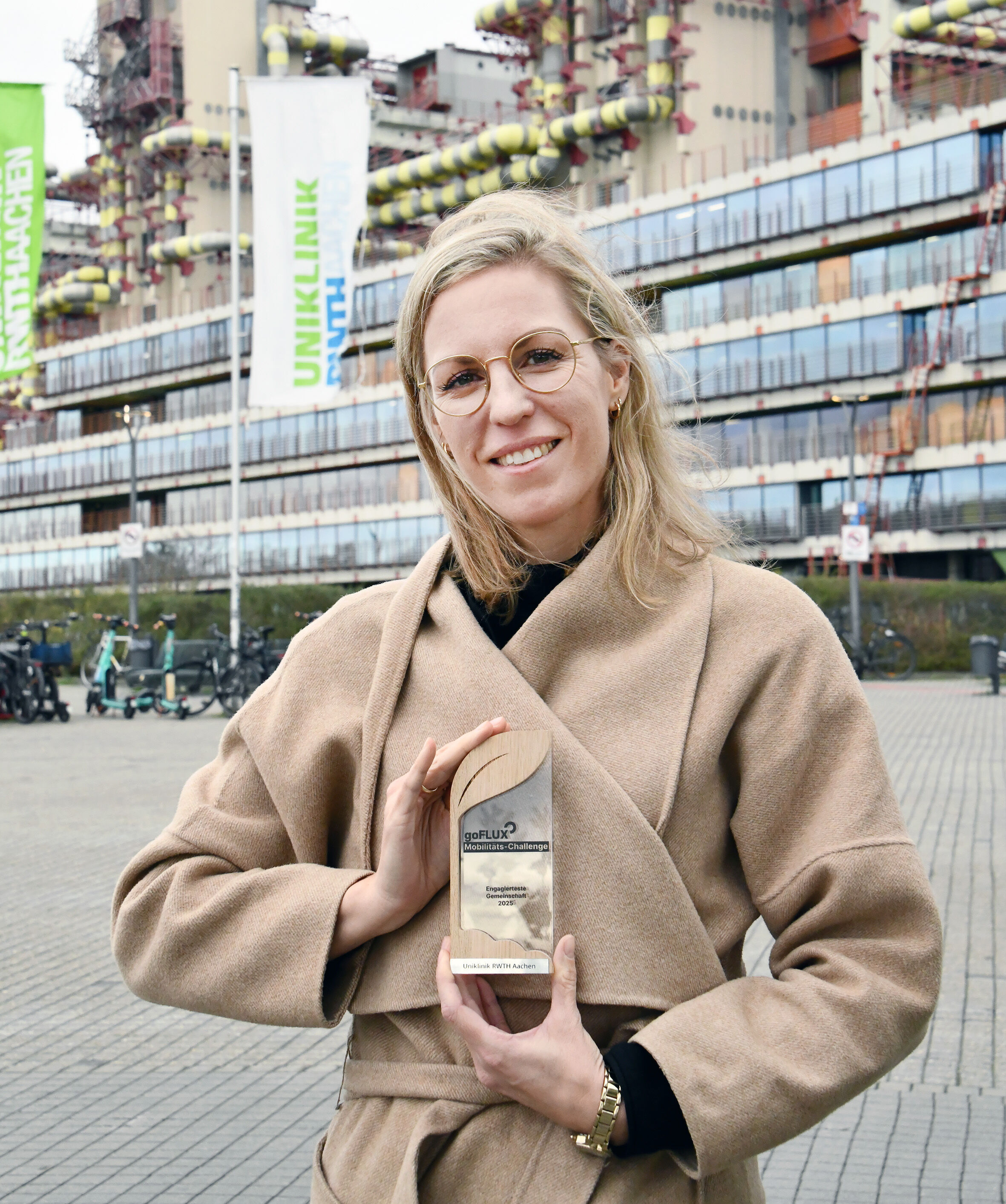 Die Uniklinik RWTH Aachen gewann dabei den Preis in der Kategorie „Engagierteste Gemeinschaft“ und setzte sich gegen weitere Unternehmen wie die Fraport AG oder die Uniklinik Bonn durch. „Es ist großartig zu sehen, dass das Fahrgemeinschaftsangebot über goFLUX so gut im Haus angenommen wird und wir jetzt sogar eine preisgekrönte Community haben. Vielen Dank an alle Kolleginnen und Kollegen, die die App in ihrem Arbeitsalltag fleißig nutzen“, freut sich Melanie Wiemuth, Nachhaltigkeitsreferentin der Stabsstelle Nachhaltigkeits- und Projektmanagement.