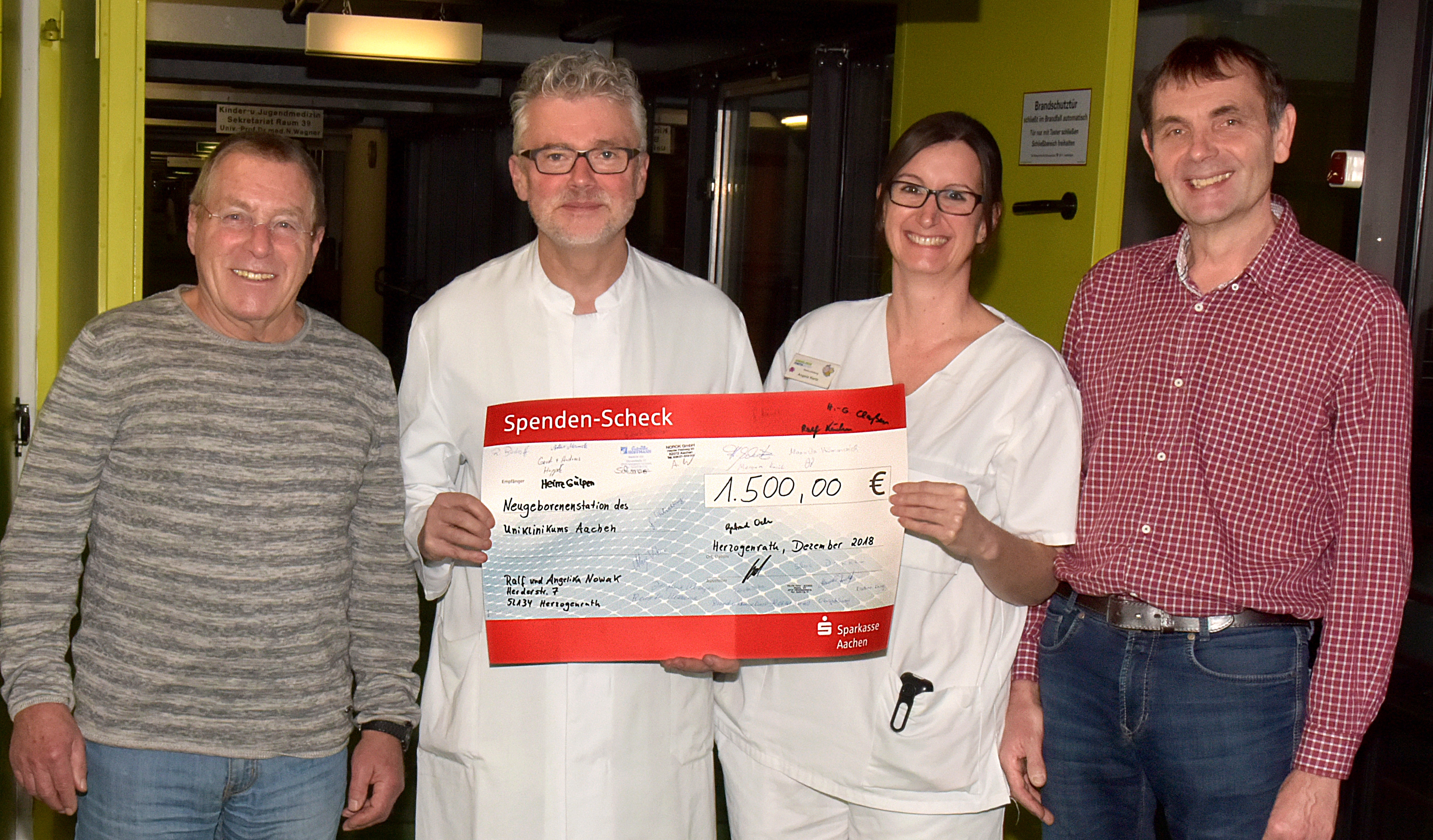 Bei den fleißigen Sammlern handelt es sich um Langläufer des Sportvereins DJK Elmar Kohlscheid, Mitarbeitende und Reinigungskräfte der Gesamtschule Kohlscheid und Freunde der Aktion. Am 10. Januar haben Ralf Nowak und Günter Hänel stellvertretend für alle Sammler einen Scheck in Höhe von 1.500 Euro an Univ.-Prof. Dr. med. Thorsten Orlikowsky, Leiter der Sektion Neonatologie, und Angela Kertz, Stationsleiterin der Früh- und Neugeborenenstation, überreicht.