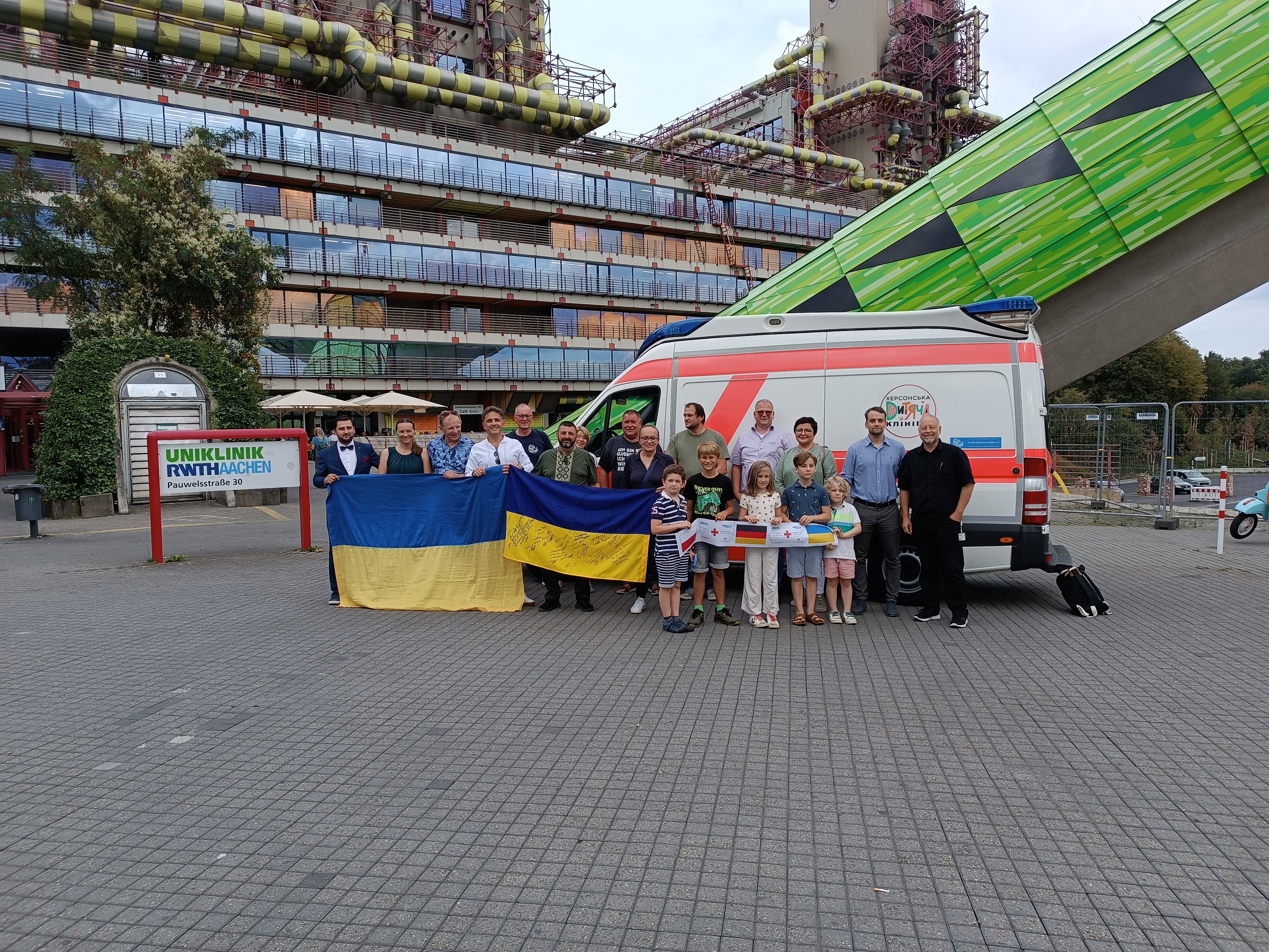 Seit Kriegsbeginn haben die Uniklinik und die RWTH mehr als 200 Transporte von medizinischen Hilfsgütern im Wert von circa 15 Millionen Euro in die gesamte Ukraine getätigt. Mehrere Hilfsorganisationen kooperieren im Rahmen des Projektes der Uniklinik RWTH Aachen „Hilfe für die Ukraine" und unterstützen dabei, die fachgerechte medizinische Hilfe bedarfsgerecht auszuliefern. Die neueste Spende, der RTW, wurde von der Hilfsorganisation gekauft und von der Uniklinik RWTH Aachen ausgestattet. Am 16. September 2023 ist er gemeinsam mit den Kindern der hiesigen Helfer offiziell an die polnisch-ukrainischen Freunde des mittlerweile großen Netzwerkes übergeben worden, die ihn in Cherson persönlich zu den dortigen Empfängern bringen werden. Es war das erste persönliche Treffen des Netzwerkes vor Ort in Aachen seit anderthalb Jahren guter Zusammenarbeit. Im Laufe der Zeit wurden alle Anfragen und Hilferufe fachlich von Kollegen aus Deutschland und Polen bearbeitet, nach kritischer Überprüfung eingekauft und unter anderem durch ukrainische Kollegen oder kooperierende Hilfsorganisationen ausgeliefert.