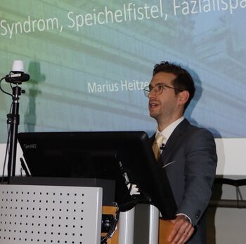 Anschließend hielt PD Dr. med. Dr. med. dent. Marius Heitzer (Arzt der Klinik für Mund-, Kiefer- und Gesichtschirurgie, Uniklinik RWTH Aachen) einen Vortrag zum Thema „Komplikationen Speicheldrüsen-Chirurgie – Frey-Syndrom, Speichelfistel, Fazialisparese“. Der Vortrag begann mit einem interessanten Einstieg: dem Frey-Syndrom. Besonders eindrucksvoll war die fotografische Darstellung des Minor-Tests, mit dem das Syndrom sichtbar gemacht werden kann. Anschließend ging er auf eine weitere Komplikation nach Speicheldrüsenoperationen ein – die Speichelfistel. Er erläuterte deren Pathophysiologie, die klinische Diagnostik und stellte die konservativen Therapieoptionen vor, die mit Scopolamin, Botox und einem Druckverband eine Erfolgsrate von rund 80 % erreichen. Abschließend widmete sich PD Dr. Dr. Heitzer der Fazialisparese, wobei er sowohl unterschiedliche Erscheinungsformen als auch therapeutische Ansätze darstellte. Besonders eindrücklich waren die beiden klinischen Fallbeispiele: Zum einen zeigte er die Möglichkeiten der statischen chirurgischen Therapie, zum anderen präsentierte er einen erfolgreichen Fall aus der Aachener Klinik, bei dem eine dynamische Rekonstruktion mittels Cross-Facial-Nerve-Graft durchgeführt worden war, um die mimische Funktion wiederherzustellen.