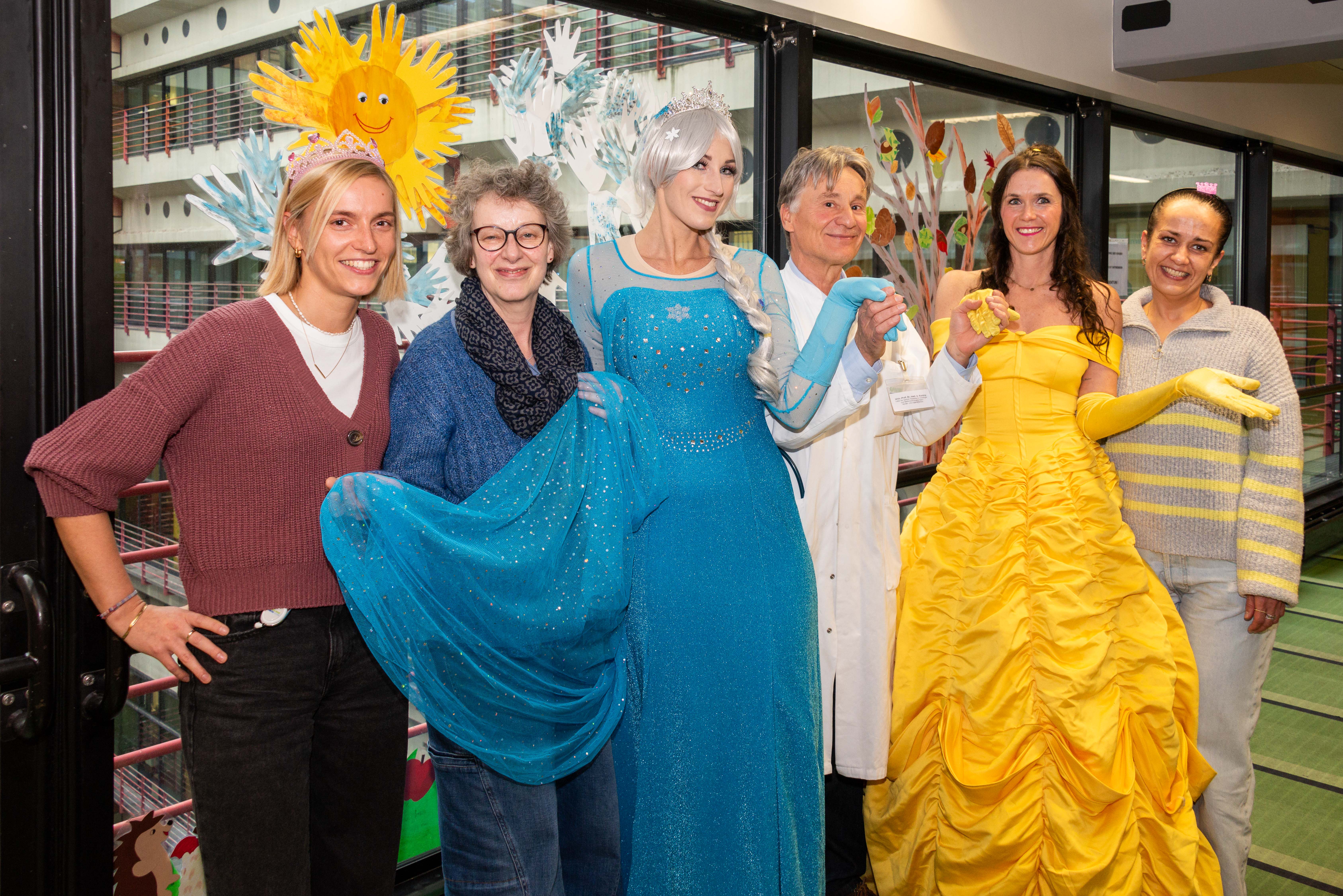 Die beiden Disney-Prinzessinnen Elsa und Belle hatten eine Audienz in der Kinderklinik. In Empfang genommen wurden sie vom Leiter der Kinderonkologie, Univ.-Prof. Dr. med. Udo Kontny, sowie den Kolleginnen Britta Koch, Jana Brendelberger und Natasha Chizari. Groß und Klein staunten nicht schlecht angesichts der originalgetreuen Kostüme von Elsa und Belle, hinter denen sich Catalina Riedel und ihre Freundin verbargen. Den beiden Disney-Fans war es ein Herzensanliegen, den jungen Patientinnen und Patienten der Kinderklinik eine Freude zu bereiten. Das gesamte Team macht einen Knicks und sagt herzlich „Danke!“