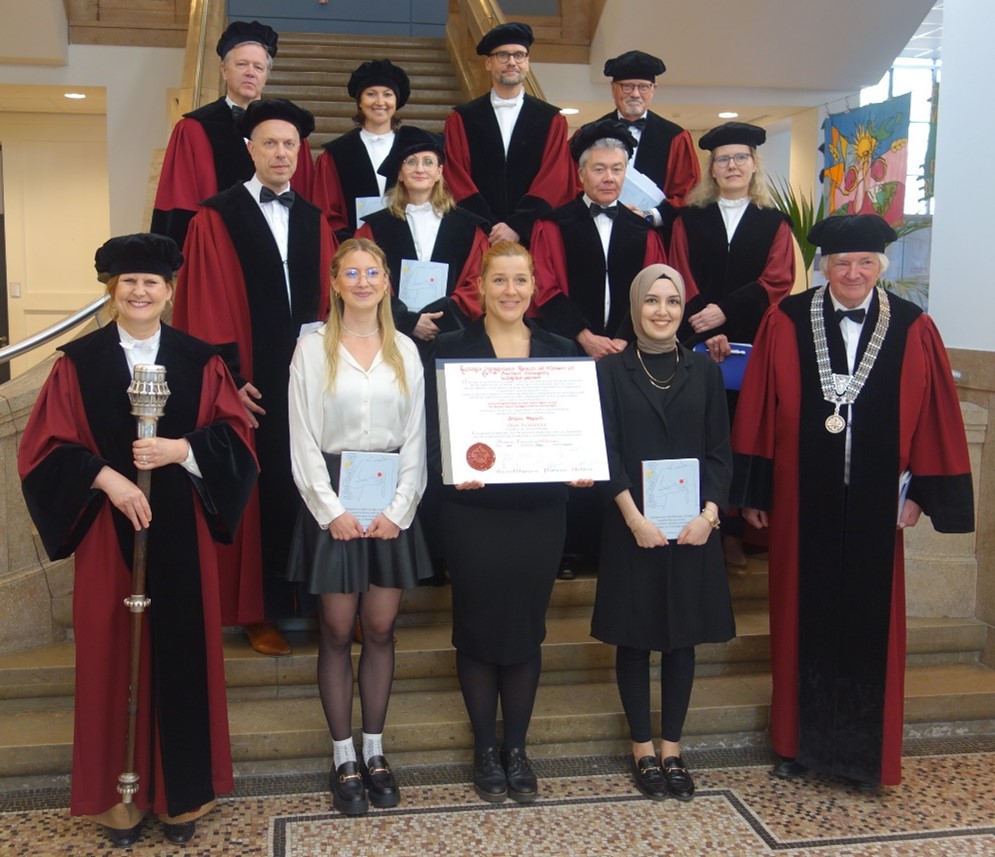 Wir gratulieren Amelie Heesch herzlich zur erfolgreich abgeschlossenen Doppelpromotion in unserem Forschungsteam. In der Dissertation mit dem Titel „Endogenous radiotherapy of triple negative breast cancer: The prostate-specific membrane antigen as a vascular target“ wurde das Prostata-spezifische Membranantigen (PSMA) als vaskuläres Target für eine endogene Radiotherapie des triple-negativen Mammakarzinoms untersucht und damit ein innovativer Ansatz für zielgerichtete Therapiestrategien erforscht. Betreut wurde die Arbeit von Univ.-Prof. Dr. Felix M. Mottaghy und Univ.-Prof. Dr. Dr. Susanne Lütje, Co-Supervisor war Dr. Agnieszka Morgenroth. Besonders hervorzuheben ist, dass die Promotion als Doppelpromotion sowohl zur Erlangung des Titels Dr. rer. nat. an der RWTH Aachen als auch des PhD an der University of Maastricht führte und damit die enge deutsch-niederländische Forschungskooperation in der Nuklearmedizin unterstreicht.