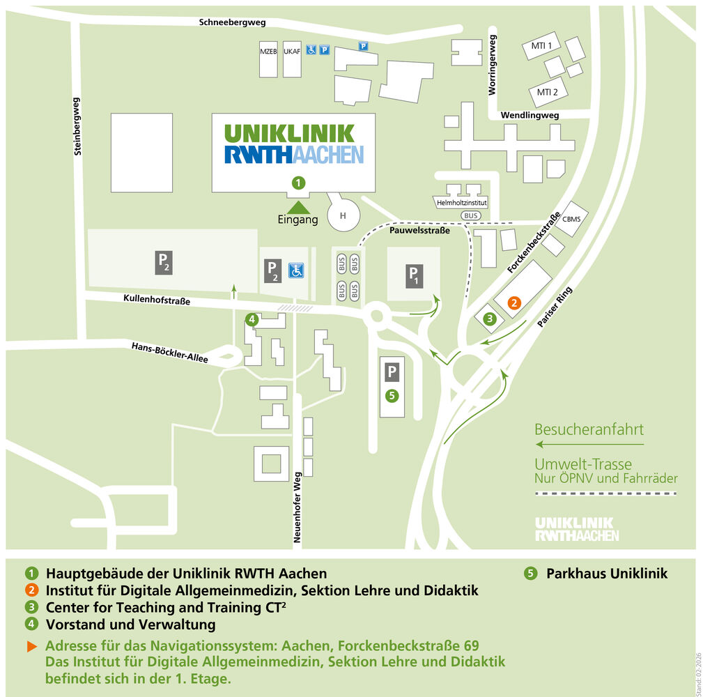 Das Institut für Digitale Allgemeinmedizin und die Sektion Lehre und Didaktik liegen an der Forckenbeckstraße 69 in 52074 Aachen. Zur Anreise mit dem Auto fahren Sie am Aachener Kreuz auf die Holland-Linie in Richtung Antwerpen/Heerlen. Sie verlassen die Autobahn bei der Ausfahrt Nr. 2 Aachen-Laurensberg, fahren rechts ab, dann weiter Richtung Uniklinik und folgen auf einem 4-spurigen Zubringer den Schildern „Uniklinik“.