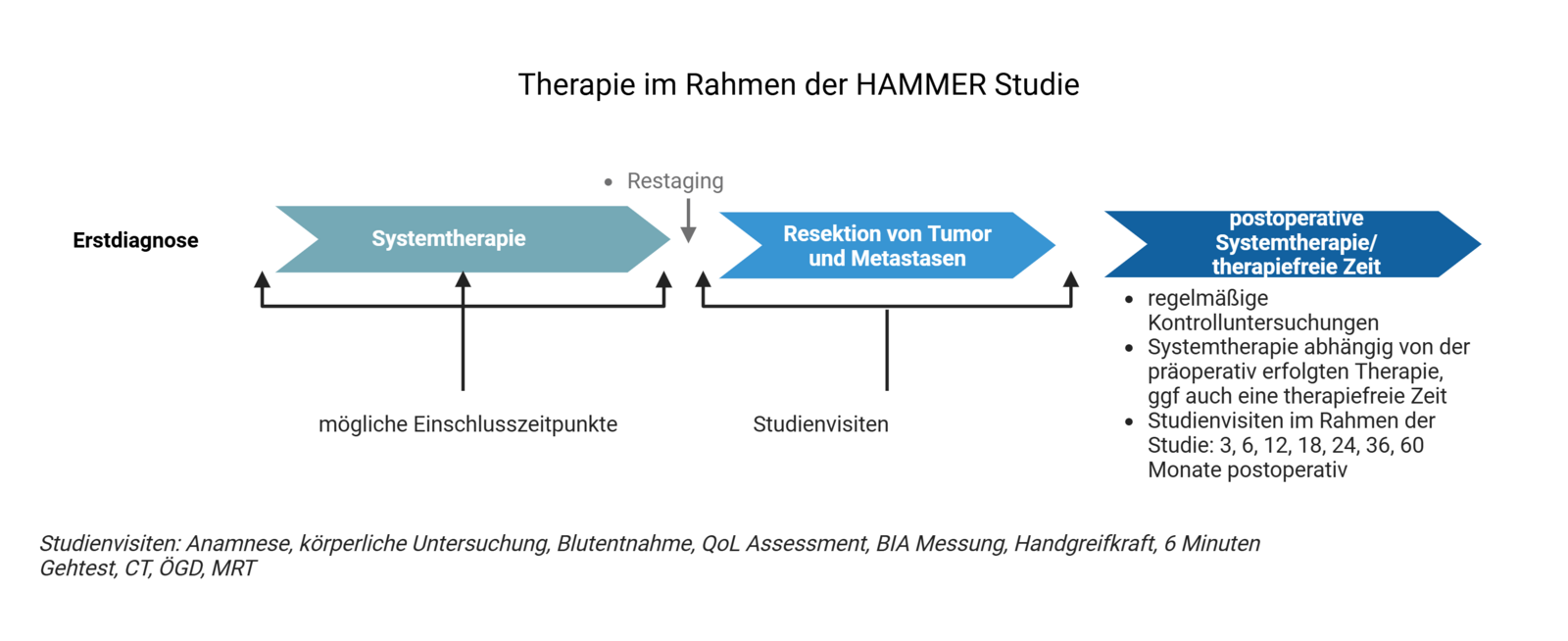 Der Patienteneinschluss wird bei jedem Patienten im Einzelfall durch das Votum einer interdisziplinären Tumorkonferenz geprüft und bestätigt. Der Einschluss kann sowohl bei Erstdiagnose als auch im Verlauf nach Systemtherapie erfolgen. Patienten mit hepatisch metastasierten Adenokarzinomen des Magens und gastroösophagealen Übergangs erhalten eine leitliniengerechte Systemtherapie für die metastasierte Erkrankung und werden anschließend für die Resektion evaluiert. Die Behandlung der Metastasen erfolgt je nach Lokalisation zeitgleich oder zweizeitig operativ oder interventionell radiologisch. Nach der Operation kann die Systemtherapie abhängig von der bereits erfolgten Therapie fortgeführt oder ein therapiefreies Intervall angeschlossen werden. Es erfolgt eine strukturierte onkologische Nachsorge (Magenspiegelung, Computertomographie Hals, Thorax, Abdomen und Magnetresonanztomographie (MRT) der Leber) zur Bestimmung des Überlebens und des tumorfreien Überlebens. Die Lebensqualität wird mittels standardisierter Fragebögen (EORTC- QLQ-C30 und QLQ-OG25) erfasst.