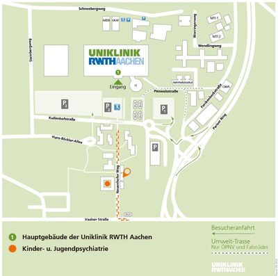 Die Klinik für Psychiatrie, Psychosomatik und Psychotherapie des Kindes- und Jugendalters ist außerhalb des Hauptgebäudes der Uniklinik RWTH Aachen in einem Gebäudekomplex bestehend aus dem restaurierten „Gut Neuenhof“ aus dem 14. Jahrhundert mit Innenhof und Gartenanlage (Neuenhofer Weg 21) und einem dreitürmigen Neubau mit großzügiger Außenanlage (Neuenhofer Weg 22) untergebracht. Im „Gut Neuenhof“ befindet sich die Kinderstation KJ01, die Tagesklinik und die Sekretariate. Im Neubau befinden sich die Eltern-Kind-Station, die Institutsambulanz, die Jugendstation KJ02, die Psychotherapiestation KJ03 und die Räume der Fachtherapien. Die interdisziplinäre Station für Psychosomatik befindet sich im Hauptgebäude der Uniklinik. Den Neuenhofer Weg erreichen Sie mit dem Buslinien 25, 35, 45, 55 von der Vaalser Straße (Haltestelle Steppenberg) aus, von dort erreichen Sie fußläufig die Kinder- und Jugendpsychiatrie.