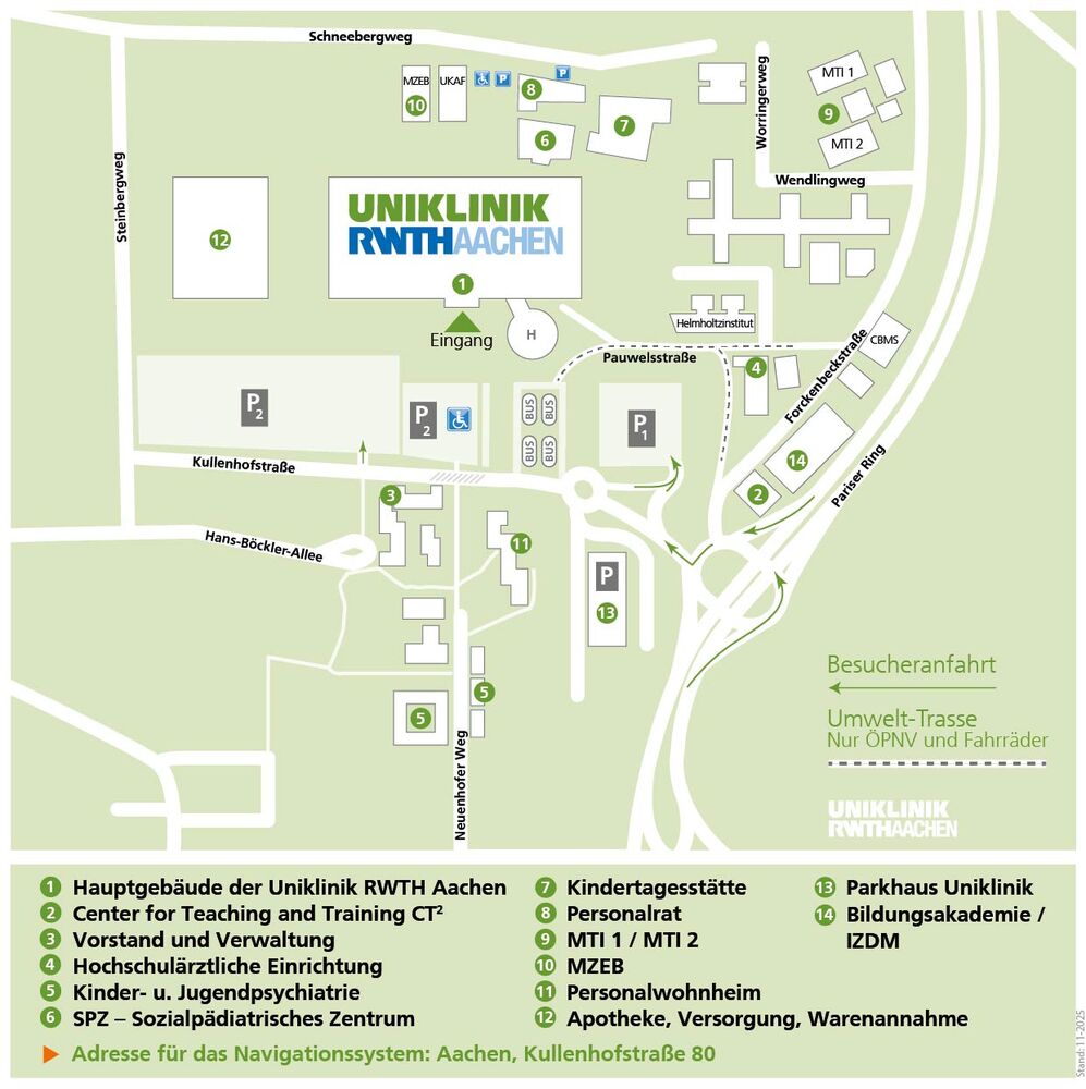 Die Uniklinik RWTH Aachen liegt an der Pauwelsstraße 30 in 52074 Aachen. Zur Anreise mit dem Auto fahren Sie am Aachener Kreuz auf die Holland-Linie in Richtung Antwerpen/Heerlen. Sie verlassen die Autobahn bei der Ausfahrt Nr. 2 Aachen-Laurensberg, fahren rechts ab, dann weiter Richtung Maastricht, und folgen auf einem 4-spurigen Zubringer den Schildern „Uniklinik“.