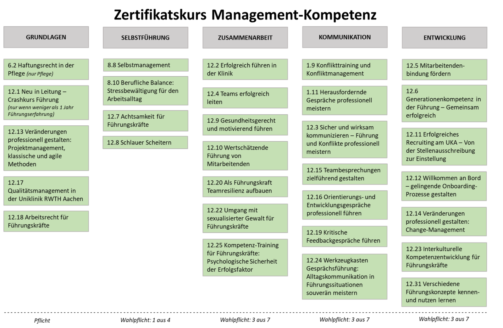 Alle Module finden als ein- oder zweitägige Seminare statt und werden mindestens einmal jährlich durch die Personalentwicklung angeboten. Ein Einstieg in das Programm ist jederzeit möglich. Wenn Sie alle Module innerhalb von zwei Jahren besuchen, erhalten Sie das Zertifikat.