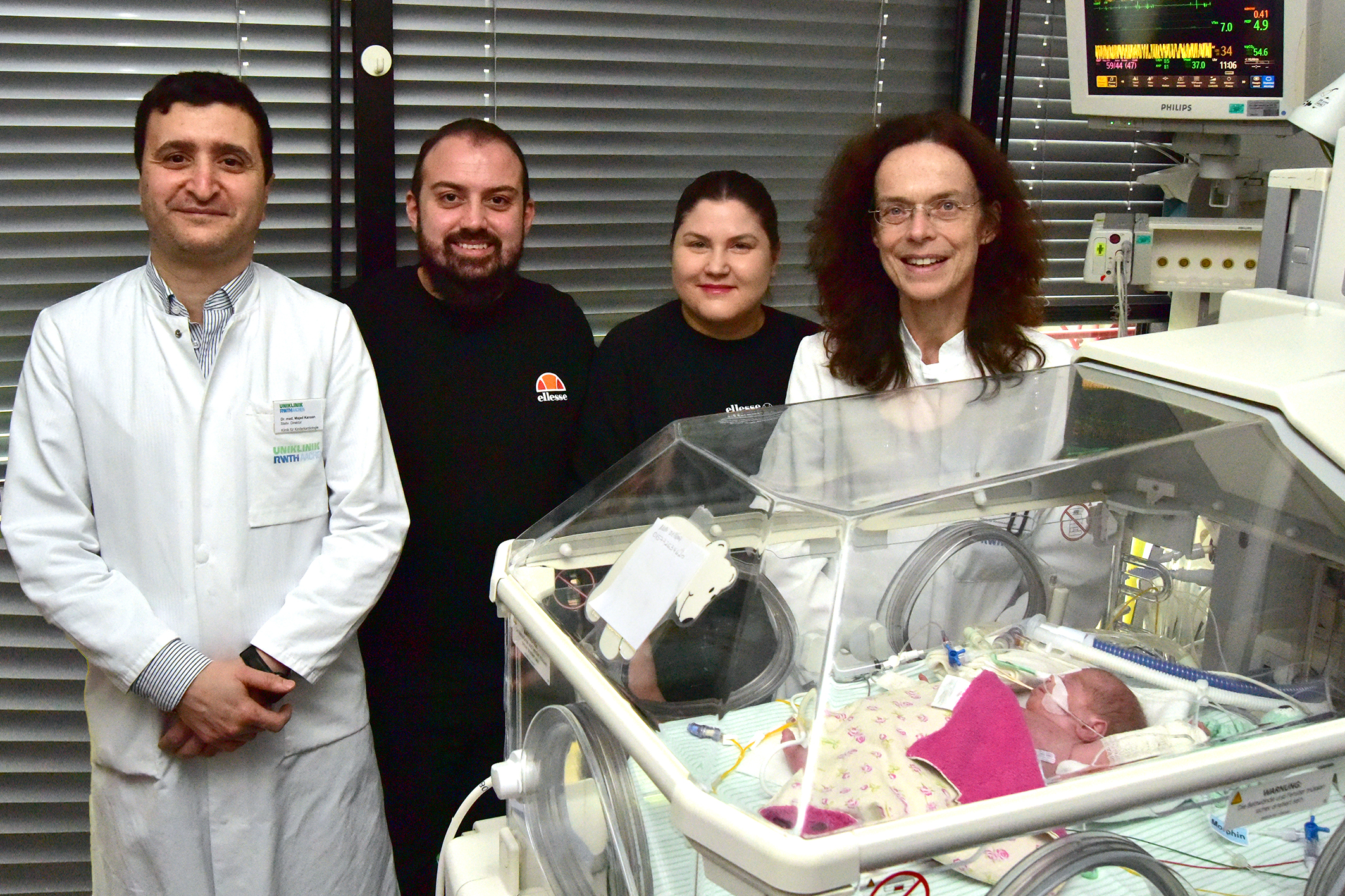 Nur 590 Gramm wog die kleine Almina, als sie als Extremfrühchen in der 25. Schwangerschaftswoche zur Welt kam. Im Alter von sieben Wochen wurde sie zur Behandlung in die Uniklinik RWTH Aachen verlegt – das frühgeborene Mädchen litt unter einem offenen Ductus arteriosus, eine offene Verbindung im Herzen, zwischen der Haupt- und der Lungenschlagader. „Der Ductus arteriosus dient dazu, das Blut weitgehend am Lungenkreislauf vorbeizuleiten, da beim Fötus die Lungen nicht arbeiten und die Sauerstoffversorgung über die Mutter erfolgt“, erklärt Dr. med. Majed Kanaan. „Nach der Geburt entfalten sich die Lungen und das Neugeborene beginnt zu atmen. Da der Ductus arteriosus nicht mehr gebraucht wird, verschließt er sich in der Regel innerhalb von Stunden bis Tagen nach der Geburt. Wenn der Verschluss ausbleibt – was häufig bei Frühgeborenen der Fall ist – sprechen wir von einem offenen beziehungsweise persistierenden Ductus arteriosus (PDA)“.