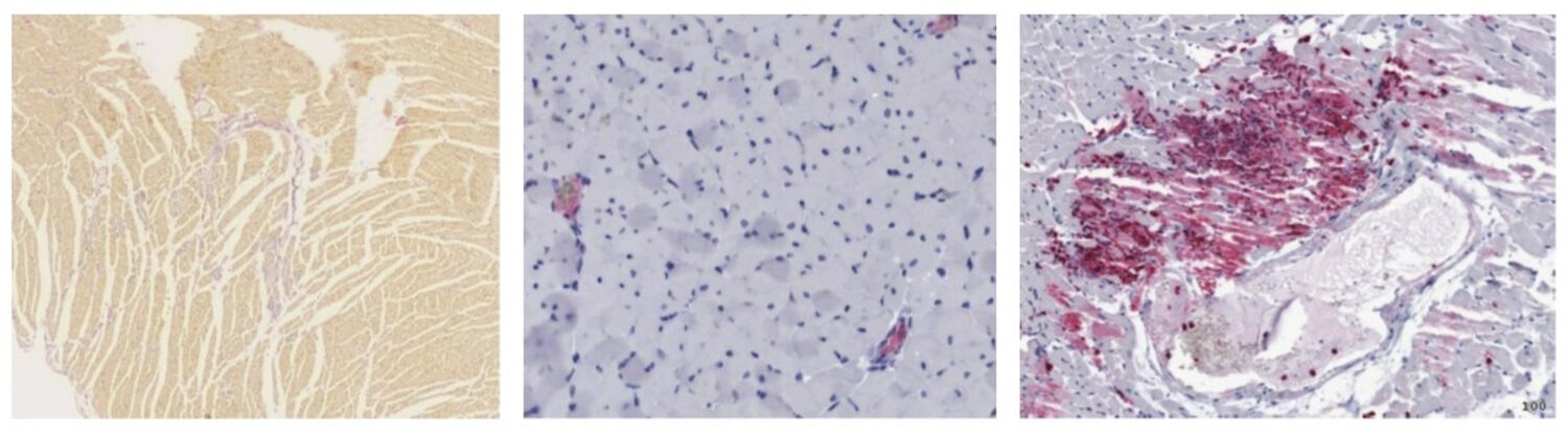 Weit weniger bekannt ist die kardiale Schädigung in Folge eines akuten Leberschadens. Sowohl klinisch, als auch experimentell lassen sich ein diffuser Myokardschaden als Ursache einer erhöhten Sterblichkeit nachweisen. Die Ursache könnte hier in der Störung der Mikrozirkulation liegen, da sich sowohl perivaskuläre Läsionen, als auch Mikrothromben nachweisen lassen (siehe Abbildung).