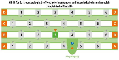 Sie treten durch den Haupteingang ein und gehen hinter der Rolltreppe zum Aufzug B3. Bitte melden Sie sich auf der 3. Etage an der Leitstelle B4 ca. 15 Min. vor Ihrem Termin an.