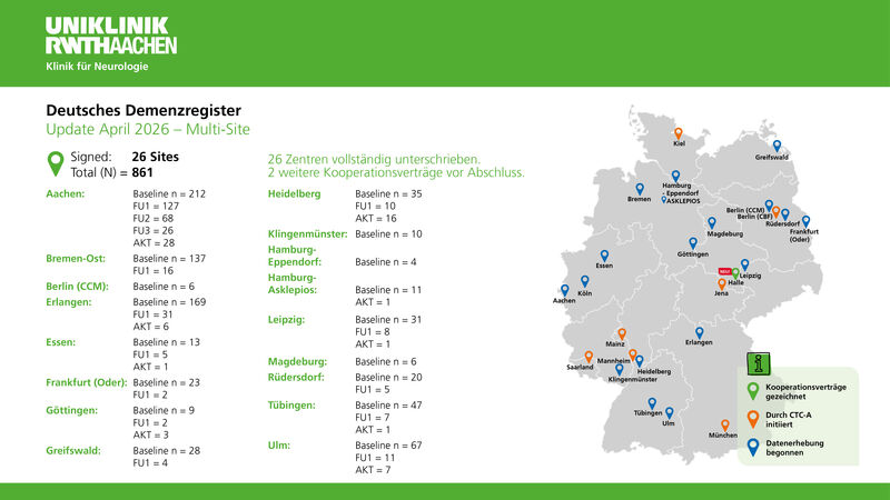 Das Deutsche Demenzregister ist ein multizentrisches, nationales und offenes Register, welches in der Uniklinik RWTH Aachen unter Leitung von Univ.-Prof. Dr. med. Jörg B. Schulz geführt wird. Das Deutsche Demenzregister kommt in den Gedächtnisambulanzen des Deutschen Netzwerkes Gedächtnisambulanzen (DNG) zum Einsatz und wird von der Alzheimer Forschung Initiative (AFI) e.V. unterstützt. Die Studie wird in enger Zusammenarbeit mit dem Clinical Trial Center Aachen (CTC-A) und dank Unterstützung des Instituts für Medizinische Informatik (IMI) von der Klinik für Neurologie umgesetzt und von den Industriepartnern Biogen GmbHEisai GmbH und Lilly Deutschland GmbH finanziell unterstützt.
