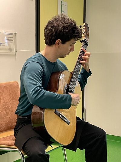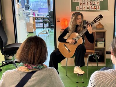 Seit Dezember 2025 finden auf der Palliativstation Gitarrenkonzerte statt, die Patientinnen und Patienten, Angehörigen und auch Mitarbeitenden eine kleine Auszeit ermöglichen. Einmal im Monat spielen Studierende der Gitarrenklasse von Prof. Huppertz von der Hochschule für Musik und Tanz Köln/Aachen und erfreuen mit ihrer Musik rein ehrenamtlich. Dafür dankt das Team der Klinik für Palliativmedizin sehr und freut sich auf weitere Konzerte.