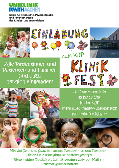Die Klinik für Psychiatrie, Psychosomatik und Psychotherapie des Kindes- und Jugendalters an der Uniklinik RWTH Aachen veranstaltet am 11. September 2024 von 15:00 bis 18:00 Uhr ein Klinikfest für alle Patientinnen und Patienten, deren Eltern sowie für Mitarbeiterinnen und Mitarbeiter. Das Fest findet in der KJP Mehrzweckhalle Außenbereich, Neuenhofer Weg 22, 52074 Aachen, statt. Für das leibliche Wohl ist bestens gesorgt!