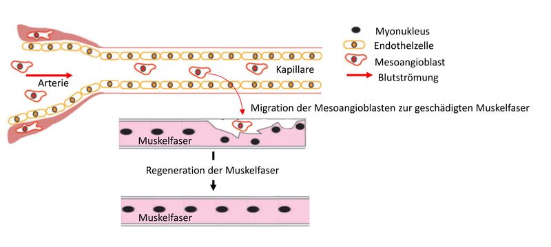 In unserem Teilprojekt werden wir zu den Zielen von FIT mit einem neuartigen 3D-In-vitro-Gewebemodell beitragen. Die Grundlage dieses Modells wurde in unserem Labor im Rahmen des vorausgegangenen Interreg-Projektes GYM entwickelt. Im Rahmen von FIT werden wir die biologische Leistungsfähigkeit des Modells weiter verbessern und es nutzen, um den komplexen Mechanismus der transendothelialen Migration, der noch nicht vollständig verstanden ist, in vitro zu untersuchen. Dies ist wichtig, da ein grundsätzliches Problem systemischer Stammzelltherapien ihre geringe Effizienz darstellt. In den meisten Fällen erreicht nur ein kleiner Teil der injizierten Stammzellen den erkrankten Muskel. Ein besseres Verständnis darüber, wie die transendotheliale Migration verbessert werden kann, könnte daher zu einer Steigerung der Effizienz der Stammzelltherapie in der klinischen Anwendung führen (Abb. 1).