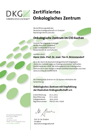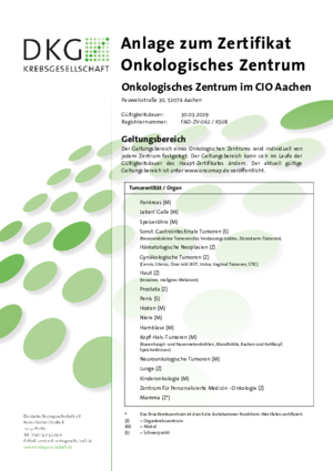 In 2013 erfolgte die erstmalige Zertifizierung des Krebszentrums nach den Qualitätskriterien der Deutschen Krebsgesellschaft (DKG) für die Behandlung von Tumorerkrankungen, nach Begutachtung durch die Zertifizierungsstelle OnkoZert. Dieses unabhängige Institut widmet sich im Auftrag der DKG ausschließlich der Überprüfung und Kontrolle Onkologischer Zentren und Organkrebszentren. Das CIO Aachen ist als Onkologisches Zentrum ein Kooperationsverbund aller Kliniken und Institute der Uniklinik RWTH Aachen, die an der Versorgung onkologischer Patientinnen und Patienten (Prävention, Diagnostik, Therapie und Nachsorge) sowie der Erforschung onkologischer Erkrankungen beteiligt sind. Alle diese Institute und Kliniken haben ihre Unterstützung des CIO Aachen erklärt und sind als Organkrebszenten ebenfalls durch OnkoZert zertifiziert. Die Kooperation aller dieser Kliniken und Institute wird von den Kernstrukturen des CIO Aachen organisiert.