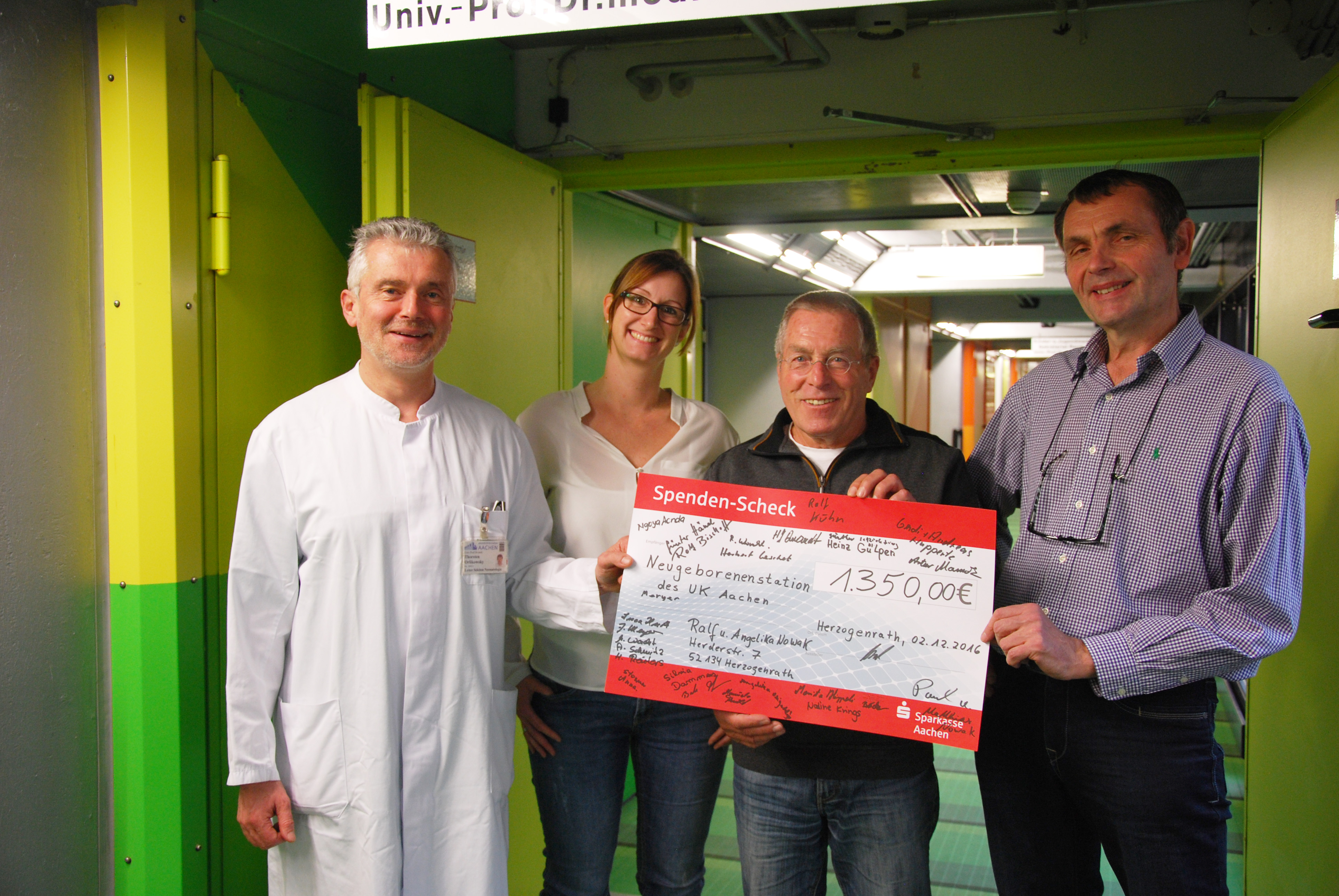 Bereits zum dritten Mal haben die Flaschensammler die Sektion Neonatologie der Uniklinik RWTH Aachen mit ihrer Spende bedacht. Die Sammler sind Langläufer des Sportvereins DJK Elmar Kohlscheid, Mitarbeiter und Reinigungskräfte der Gesamtschule Kohlscheid und Freunde der Aktion. Sie sammeln die Flaschen beim Laufen im Wald oder auf dem Schulhof und spenden den Erlös eines gesamten Jahres für einen guten Zweck. Anfang Dezember haben, stellvertretend für alle Sammler, Ralf Nowak und Günter Hänel einen Scheck in Höhe von 1.350 Euro an Univ.-Prof. Dr. med. Thorsten Orlikowsky, den Leiter der Sektion Neonatologie der Klinik für Kinder- und Jugendmedizin, und Angela Kertz, die Stationsleiterin der Früh- und Neugeborenenstation, überreicht.