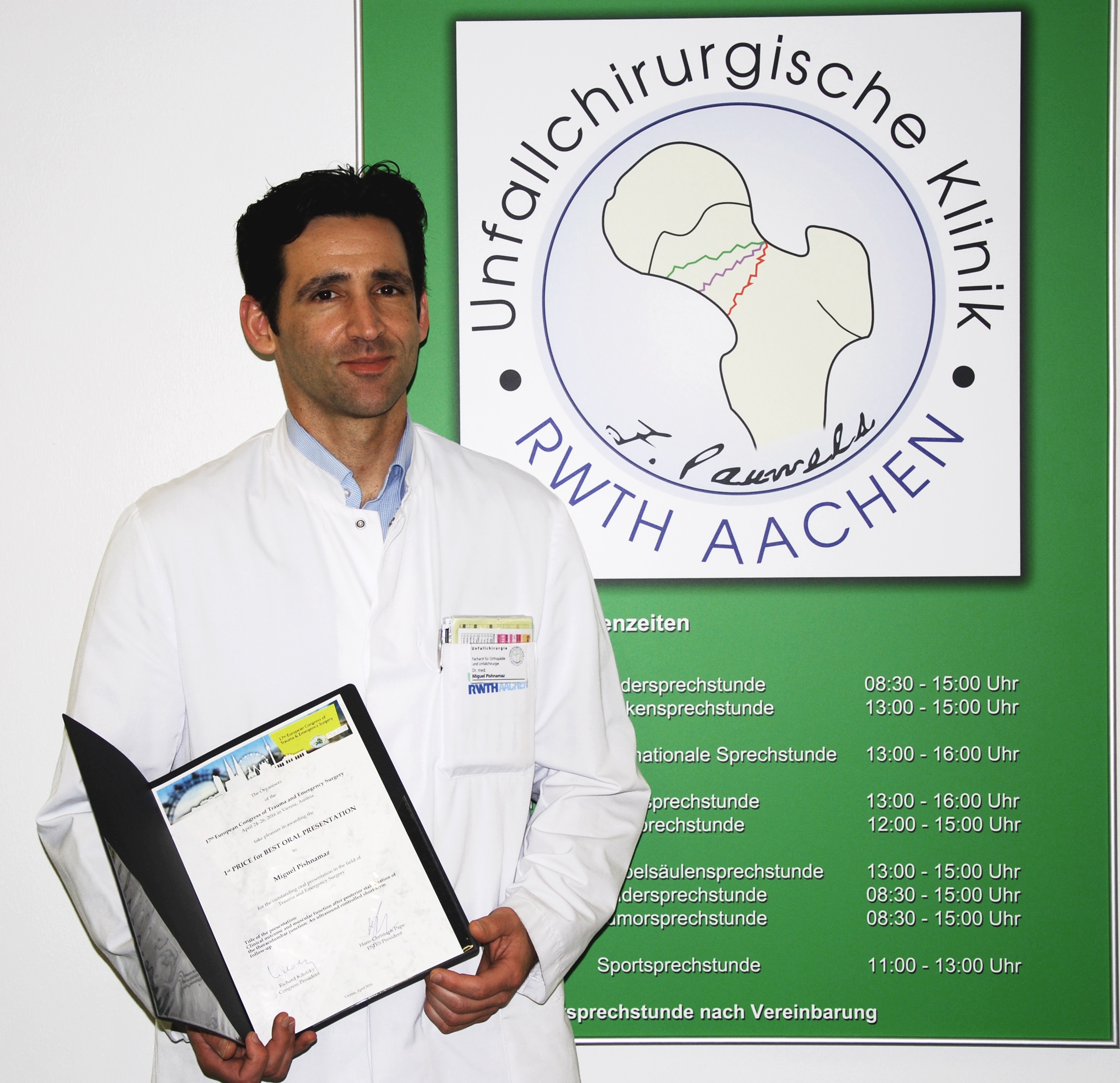 Am 26.04.2016 erhielt der Aachener Unfallchirurg Dr. Miguel Pishnamaz auf dem Jahreskongress der "European Society for Trauma and Emergency Surgery" (ESTES) in Wien die Auszeichnung für die beste Vortragspräsentation. Dr. Pishnamaz Vortrag "Clinical outcome and muscular function after posterior stabilization of the thoracolumbar junction: An ultrasound controlled short-term follow-up" befasst sich mit der Rehabilitation von Patienten, die einen Wirbelsäulenbruch erlitten haben und in der Folge durch eine Operation stabilisiert worden sind. Der Preis ist mit 1.000 Euro dotiert.
