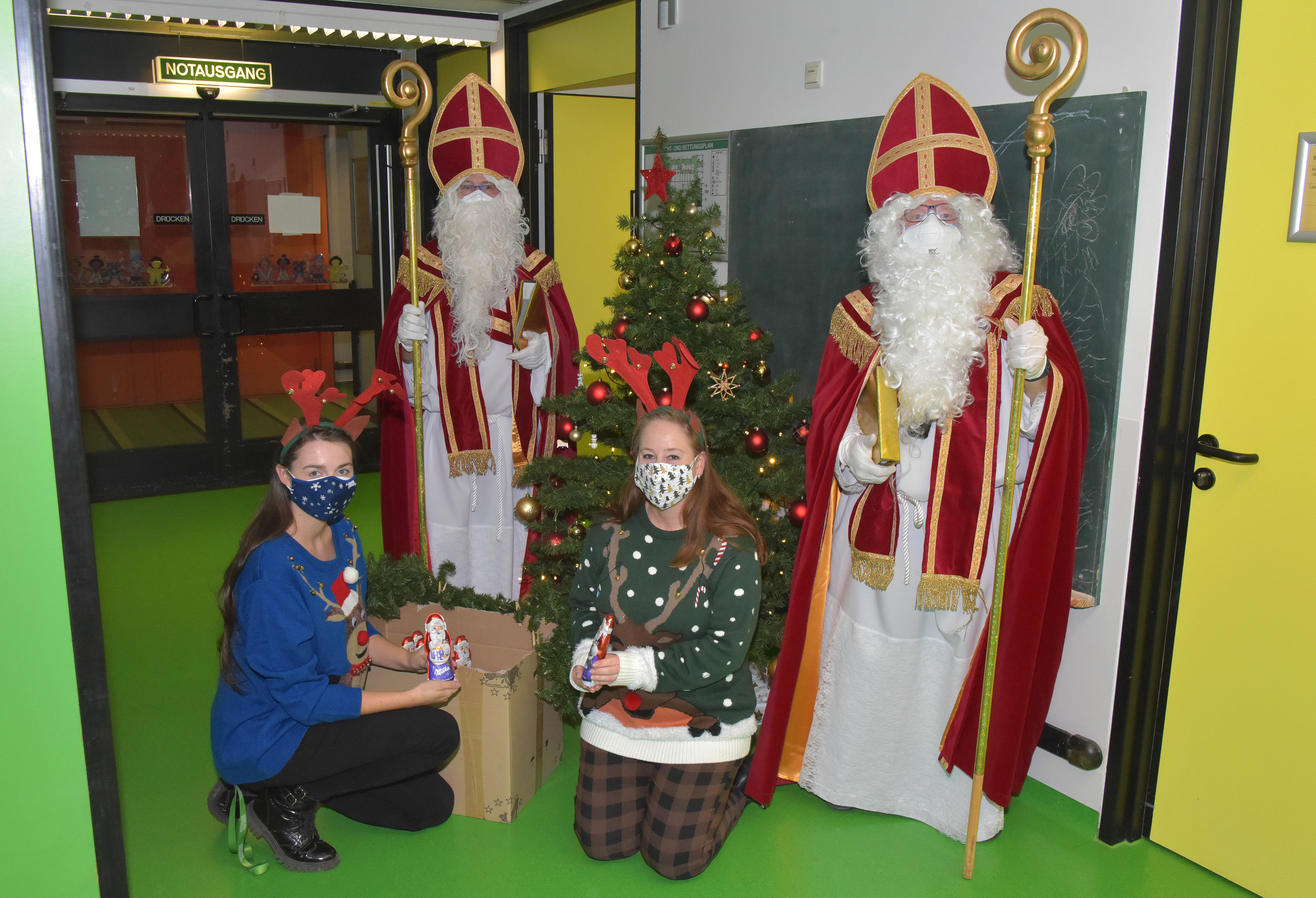 Gleich zwei Nikoläuse haben am 6. Dezember 2021 die kleinen Patientinnen und Patienten der Klinik für Kinder- und Jugendmedizin an der Uniklinik RWTH Aachen mit Schokonikoläusen erfreut. Hinter den Bärten und coronabedingten FFP2-Masken verbergen sich die beiden Uniklinik-Mitarbeiter Dirk Strickstrock (links) und Wilfried Niepel (rechts), die sich bereits seit vielen Jahren ehrenamtlich engagieren und die Kinderaugen immer wieder zum Strahlen bringen. Der Kinder- und Jugendtreff dankt den Ehrenamtlern und Spendern für die gelungene Überraschung und hofft darauf, im nächsten Jahr wieder eine Nikolausfeier veranstalten zu können.
