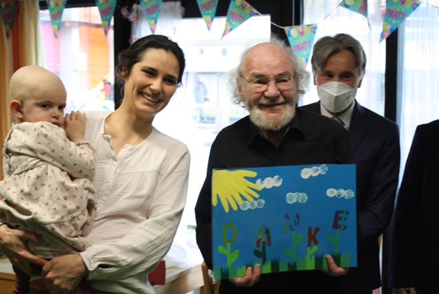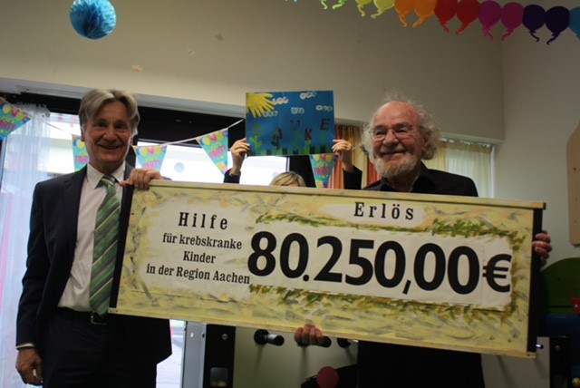 Seit mehr als 30 Jahren ist Reiner Jakobs als singender Hirte und Spendensammler für den Förderkreis Hilfe für krebskranke Kinder e. V. Aachen aktiv. Am 24. Februar 2024 übergab er in der Uniklinik RWTH Aachen eine Spende in Höhe von 80.250 Euro an Univ.-Prof. Dr. med. Udo Kontny, Leiter der Sektion Pädiatrische Hämatologie, Onkologie und Stammzelltransplantation, sowie Susanne Göschel, 1. Vorsitzende des Förderkreises Hilfe für krebskranke Kinder e. V. Aachen.